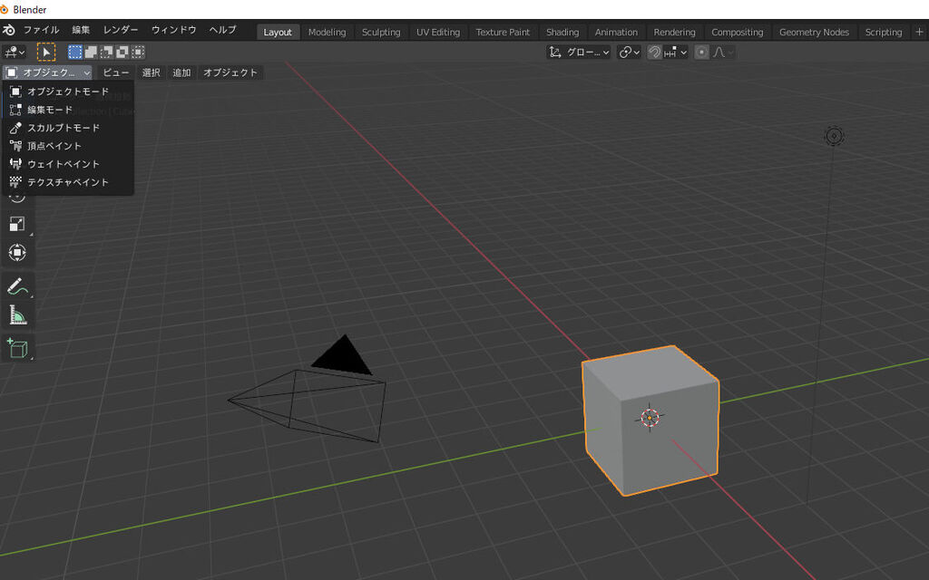 ウェイトペイントモードが現れなかったので、気分転換に、Blenderのデフォルトの最初のCubeを出してみる。そこで左上をクリックすると・・・